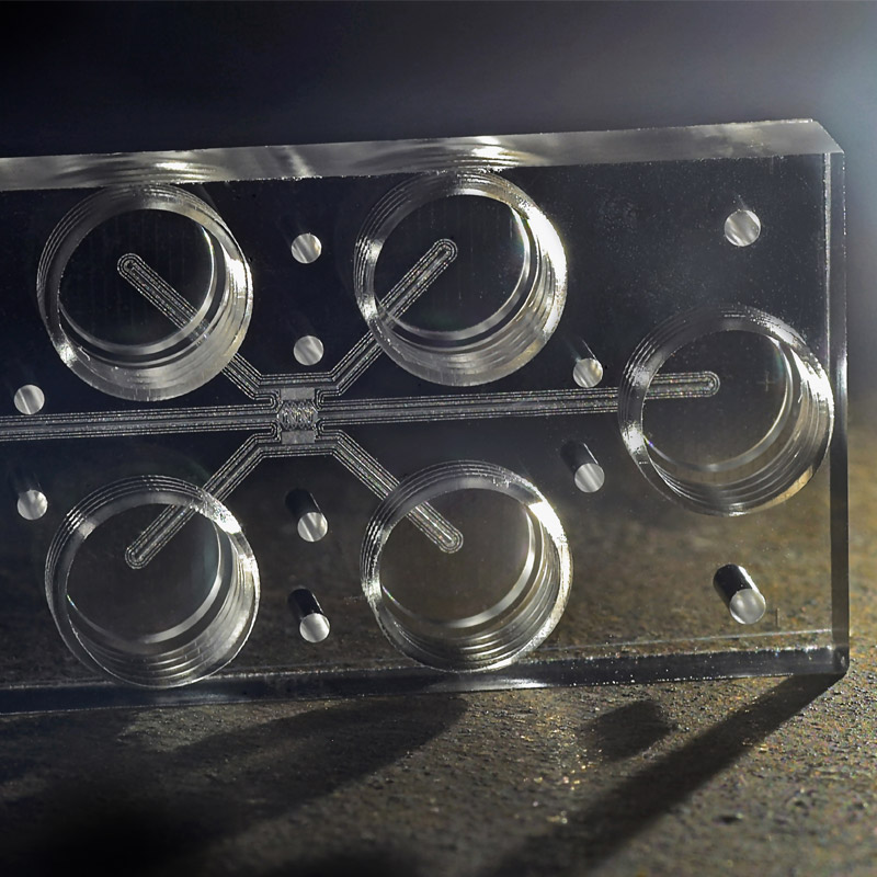 Microchannels with constrictions, branches, and connector elements (threads, Luer, etc.) in all three spatial dimensions.